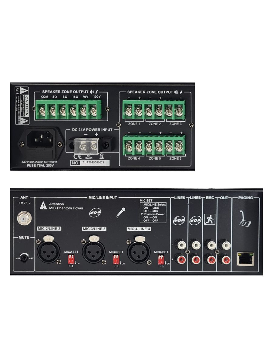 Мощность усилителя, RMS/пик: 500 Вт Входы: 4 Mic, 3 Aux Выходы: 70V/100V/4-16ohm Размер (ШхВхГ): 484×88х405 мм Вес: 14,5 кг Дополнительно: Mp3, SD, USB, BT, FM тюнер, 6 зон аттенюатор