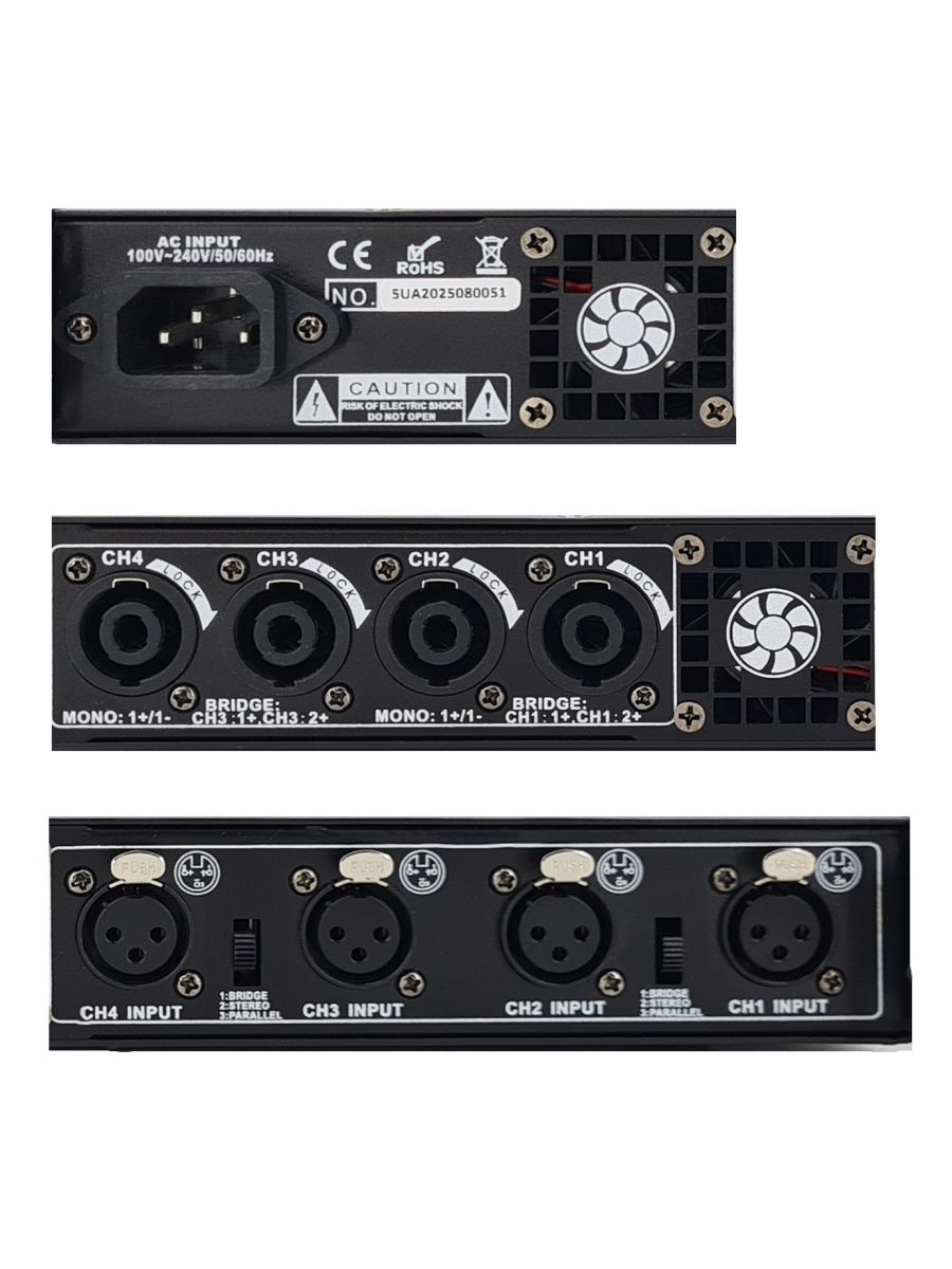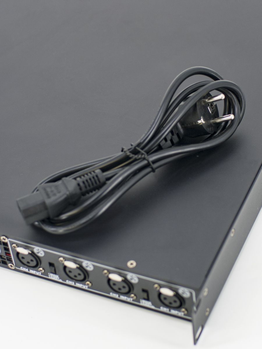 Класс: D Мощность RMS/Пик (4 Ом): 4х350 Вт Мощность RMS/Пик (8 Ом): 4х200 Вт Частотный диапазон, Гц: 20-20000 Соотношение сигнал/шум: >105 дБ Источник питания: AC 100~240 В, 50/60 Гц Размер (ШxВxГ): 484×375×45 мм Вес: 8.5 кг
