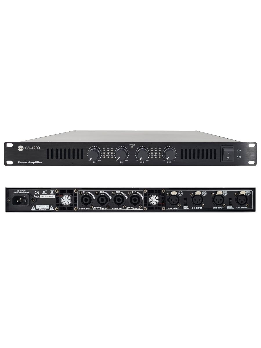 CMX Audio CS-4200 - четырехканальный усилитель мощности предназначен для профессионального аудиоприложения и стационарных звуковых систем. Он использует цифровую технологию класса D, которая помогает усилителю генерировать мощную выходную мощность, сохраняя при этом меньше тепла благодаря высокому КПД до 85%. Усилитель мощности разработан со специальным источником питания ШИМ для обеспечения его исключительной стабильности, меньшего шума и минимального нагрева. Его номинальная мощность составляет 4 × 200 Вт при 8 Ом. Усилитель поддерживает 8 Ом и 4 Ом, а универсальный режим стерео, параллельный и мостовой режимы позволяют ему хорошо работать с линейными динамиками, сабвуферами и профессиональными громкоговорителями. С полной защитой от перегрузки, высокой температуры и короткого замыкания этот усилитель работает в тяжелых рабочих условиях.