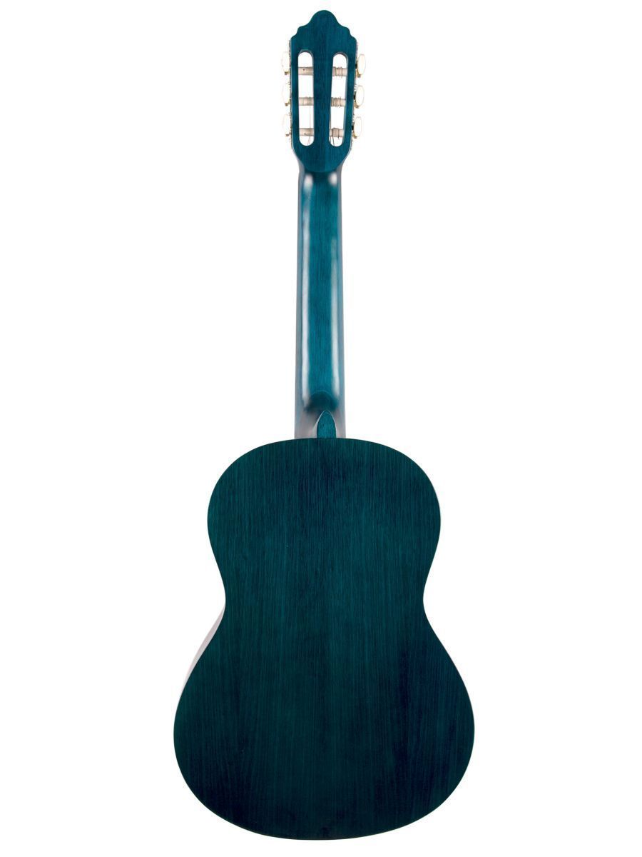 Valencia VC203TBU Гитара классическая 3/4, верхняя дека: ель, нижняя дека и обечайка: нато, гриф: махагони, накладка грифа и нижний порожек: махагони, колки: винтажные, никель, цвет Transparent Blue